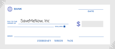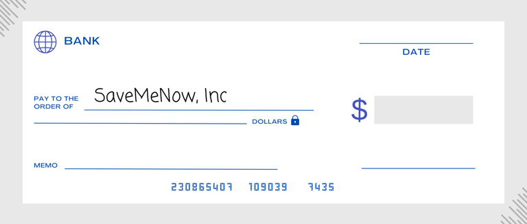 Si prefieres donar por cheque, hazlo a nombre de SaveMeNow, Inc. Incluye tu nombre, dirección y correo electrónico en el cheque o en una nota adjunta y envíalo por correo a la siguiente dirección: 140A Amicks Ferry Road #104 Chapin, SC.